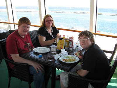 Day 3 started, in the same clothes, with a buffet breakfast at our hotel and a tour of Barcelona. The hi-lights of our day included the amazing park and the La Famila Church. This church has been under construction for over 100 years! Yikes, that is a project. We even saw a naked guy (well with a messenger bag) walking around the city. Hehehehehehe. After our 3 hour tour (I know, I kept singing Gilligan's theme song too) we got on our ship, again in our clothes from FRIDAY (not that I am counting). Our mini-suite was lovely. I can't believe that Close To My Heart gets us all balcony rooms! WOW. I did upgrade to a mini-suite for a bit more room for the four of us. It was lovely, yet small. We got on the ship, got some food and started to explore. The first night is the CTMH cocktail party, with finger foods and cocktails for all! Yum. The kids even enjoyed it. And, it is nice to see Jeanette Lynton and her hubby David and say thanks for the opportunity to take this great vacation. It is also great to see all of this years cruisers. Sailing out of Barcelona into the Mediterranean Sea was the experience of a lifetime, lovely. I couldn't believe all I had already seen, I was so excited about our week ahead. More to come tomorrow....